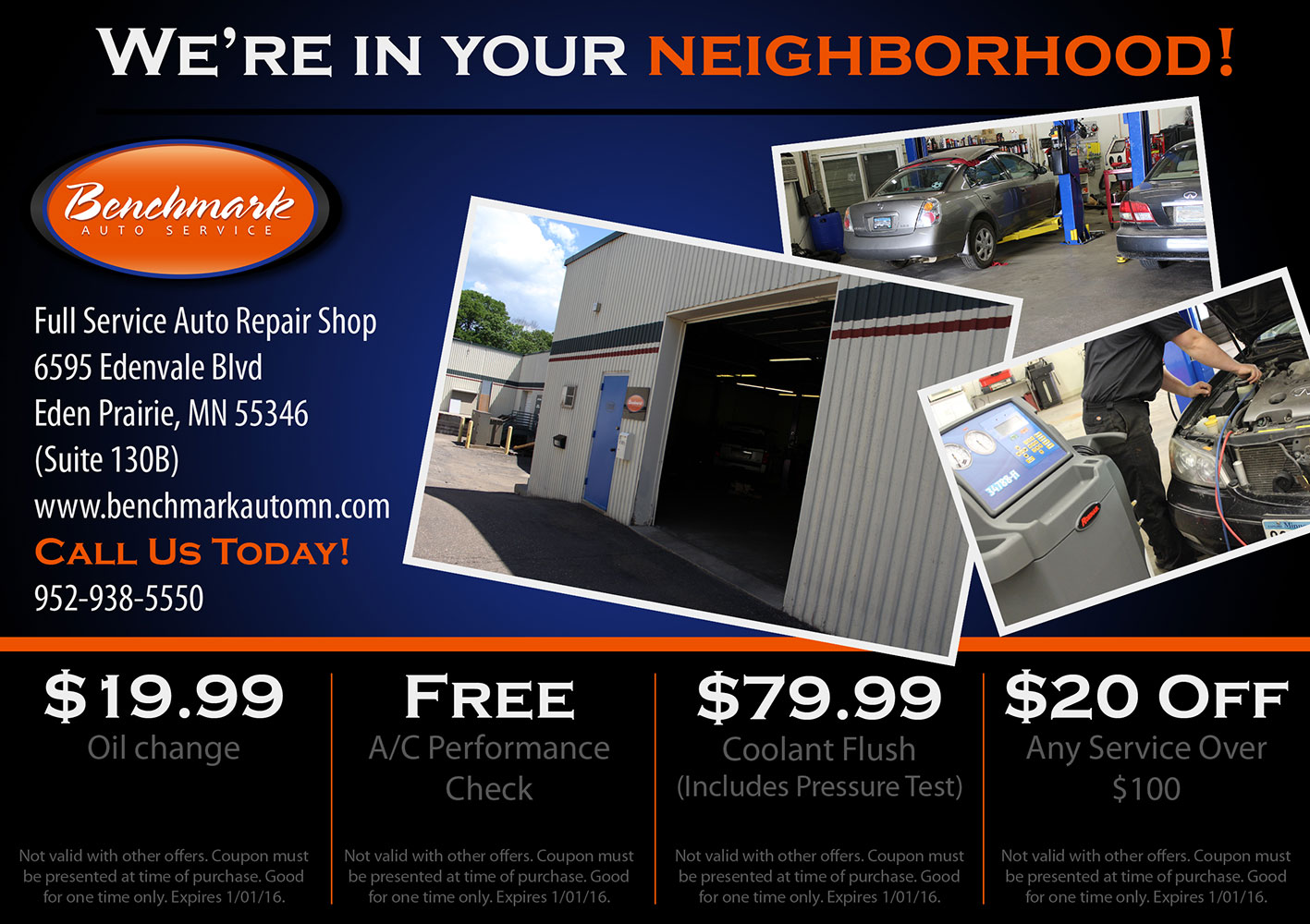 Benchmark Auto Service is a vehicle repair shop in Eden Prairie Minnesota. I started working with this company in May of 2014 and have created many promotional materials including postcards, door hangers, signs, magnets and a website.